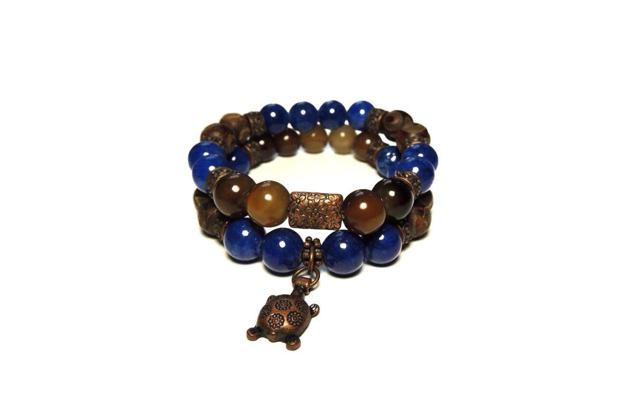 Жіночий браслет із натуральних каменів агатів і прес. Лазурит, зроблений руками в коричневому та синьому кольорі. Намистини нанизані на гумову основу, завдяки чому браслет підійде під різні розміри. Браслети зроблені з: намистин, гумки та різної яскравої фурнітури з ювелірного сплаву, яка робить його вишуканішим і оригінальнішим!
